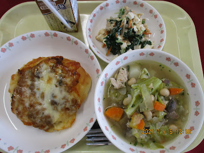 ピザパン チキンポトフ 豆腐サラダ・ごま味噌ドレッシング 牛乳