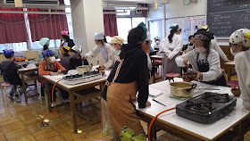12月18日(水)に、4年生が味噌汁作りにチャレンジしました。味噌汁の具は、今が旬の大根です。昨日、学級園で収穫したばかりのとても新鮮な大根を使いました。左手の猫の手を意識しながら、慣れない包丁を使い、慎重に大根を輪切りにしている様子が見られました。